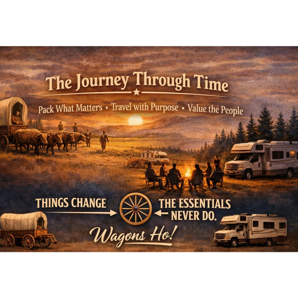 From wagon trains to RV parks, the journey still teaches the same lesson: take only what matters, travel with purpose, and value the people along the way. Some things change, the essentials never do. We may not circle the wagons at night anymore, but we still gather, share stories, and rest from the road. “Come away… and rest a while.” The road isn’t just a path, it’s a reminder. Wagons ho.