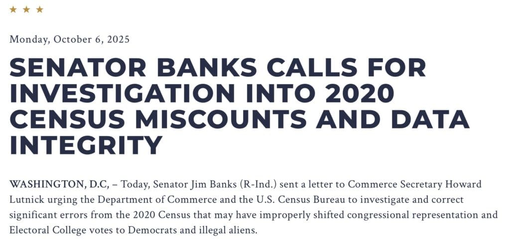 On October 6, Senator Jim Banks (R-IN) strongly urged Commerce Secretary Howard Lutnick to correct census errors before 2030 by ...